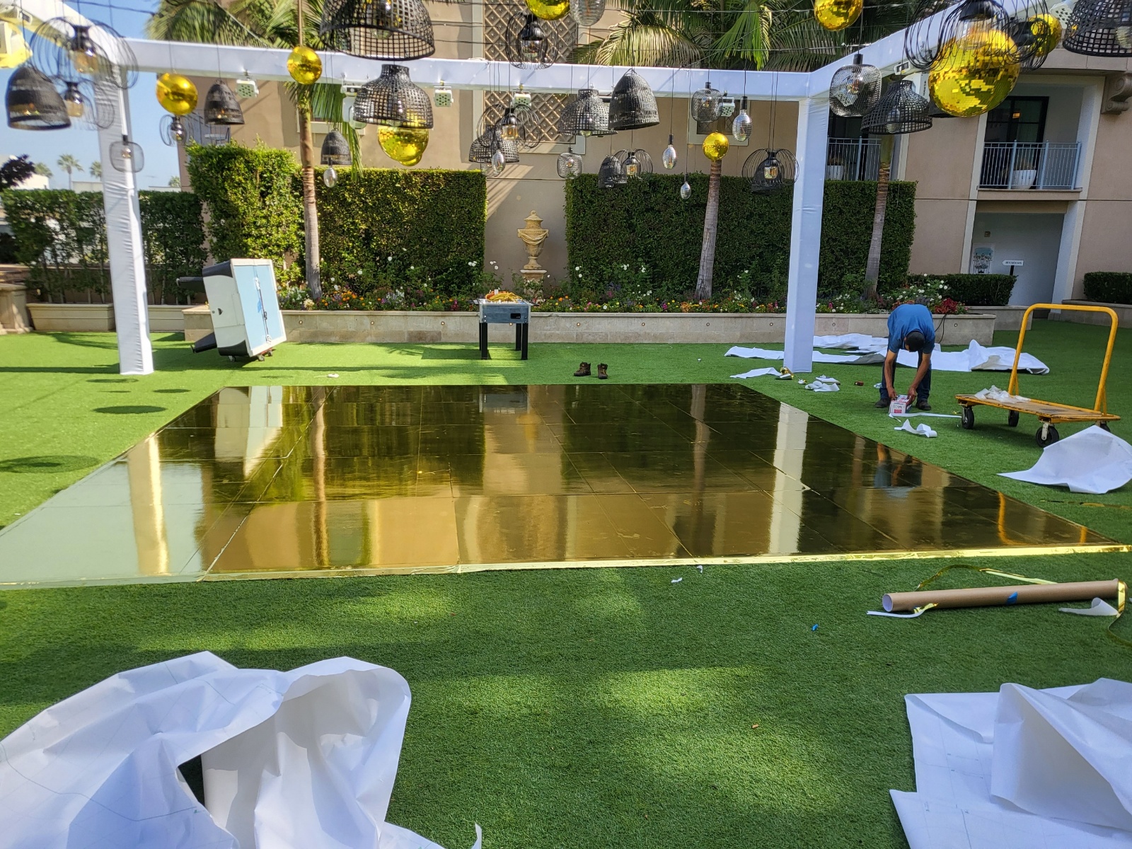 Dance floors in various colors: White, seamless white, black, blue, red, yellow, brown, gray. Weddings, quinceaneras,Bar-Bat Mitzvahs, birthday parties, and more can be more fun and distinctive with a dance floor. Installing a sophisticated dance floor can be a lot of work specially on a tight schedule therefore to instal planning and prior arrangements must be made. We have years of experience in the event rental industry and are very confident that we will meet or exceed your expectations. Because dance floors are a focal point in any event we offer custom lighting, vinyl graphics, custom logos as well as branding, gobo projectors and many other lighting options.