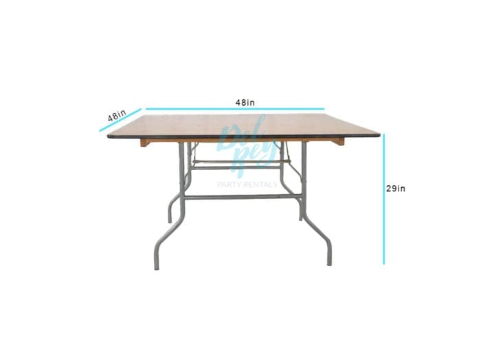 The Square Table is composed of a sturdy Plywood Top and steel folding legs. This table can comfortably seat approximately 8 people. This is a very popular product and is always in high demand. This table has commonly been used as a games table, dinner table, sweets table, or cake table. It is popularly used in all sorts of events like Weddings, Graduations, Birthday Parties, Picnics, Family Reunions, and Baby Showers. This item is eligible for the customer to pick up. Large Inventory is available.